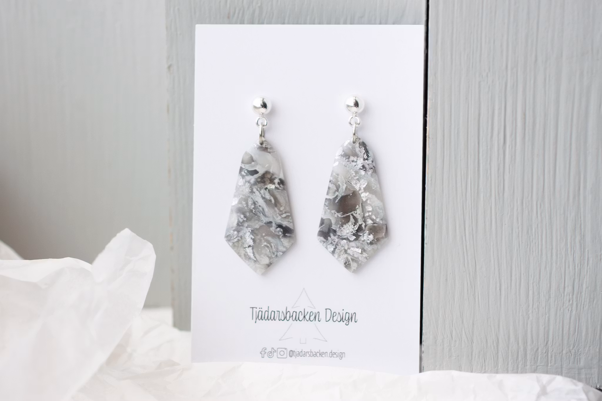Örhängen gjorda i polymerlera med ett lager resin utanpå. Silverpläterade smyckesdelar.
