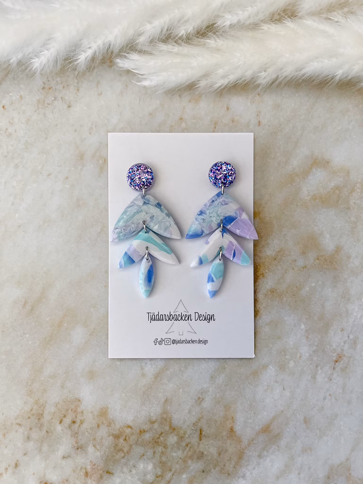 Örhängen gjorda i polymerlera med ett lager resin utanpå. Stift i titan/kirurgiskt stål. Övriga smyckesdelar i silverpläterad metall.