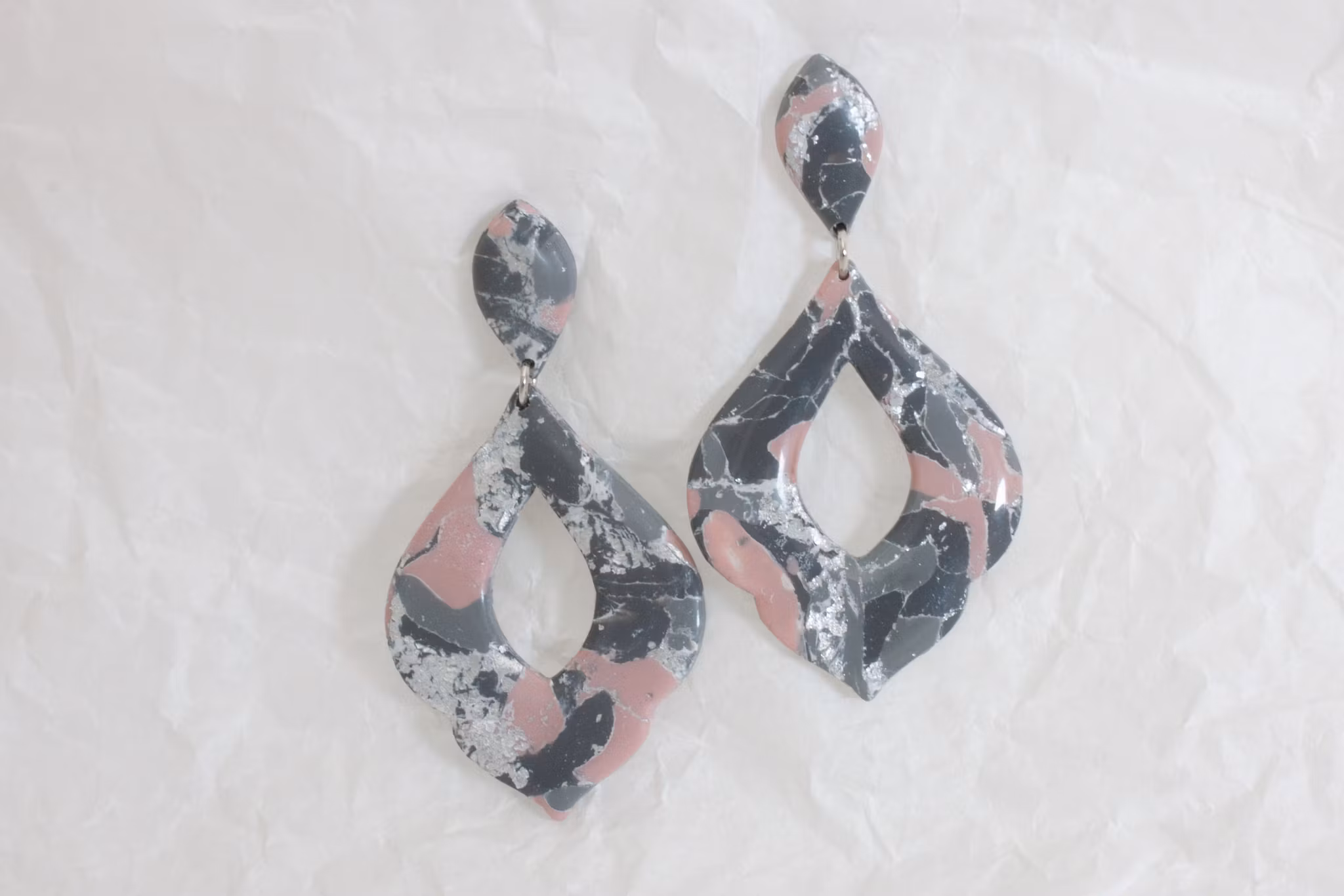 Örhängen gjorda i polymerlera med ett lager resin utanpå. Stift av titan/kirurgiskt stål. Övriga smyckesdelar i silverplätterad mässing.